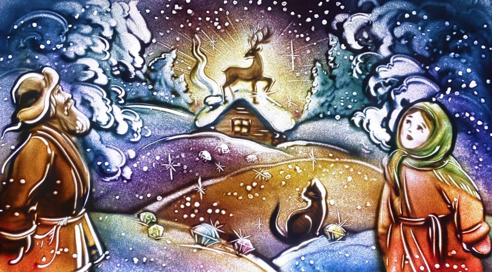 В высоких сугробах, посреди леса, стоит заснеженная избушка. В ней возле жарко натопленной печи сидит сиротка Дарёнка и слушает чудесные истории старика Коковани о волшебном козлике, у которого из-под копытца, как искры, сыплются драгоценные камни. Из трубы в морозное небо вьётся дым, а кошка Мурёнка уже слышит топот серебряного копытца...
