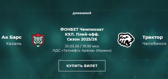 Хоккей: «Ак Барс (Казань)» - «Трактор» (Челябинск) — 2-я игра матча 1/8 финала Чемпионата КХЛ, розыгрыш Кубка Гагарина сезона 2025-2026 гг.